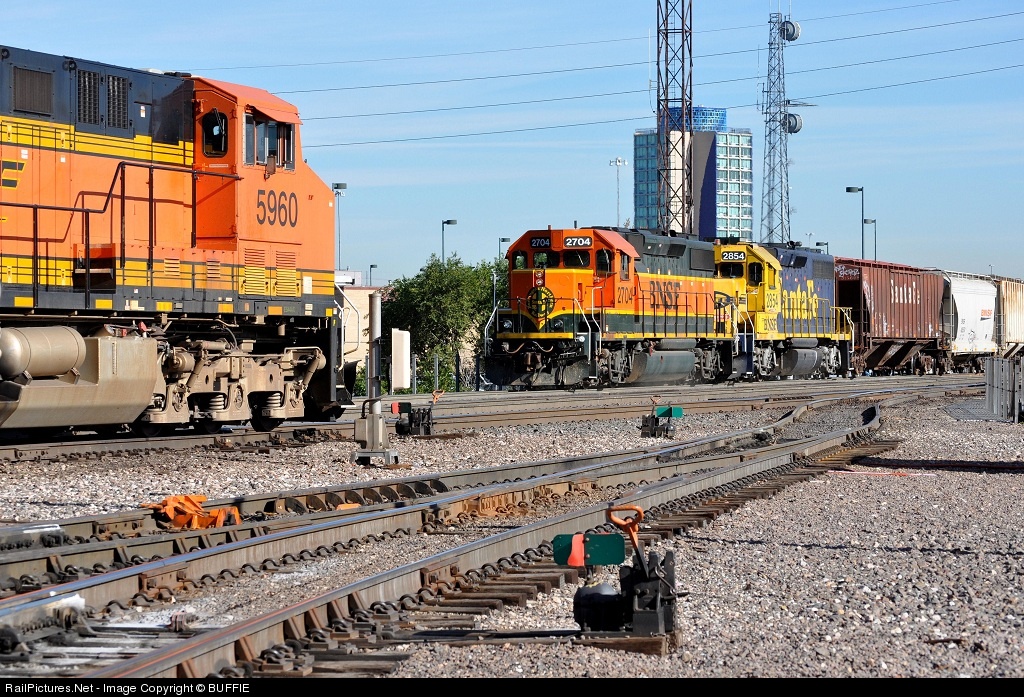 BNSF 5960 (ES44AC) is about ready to head to the Denver yard while BNSF 2704 and 2854 (both GP39-2’s) shuffle freight cars.