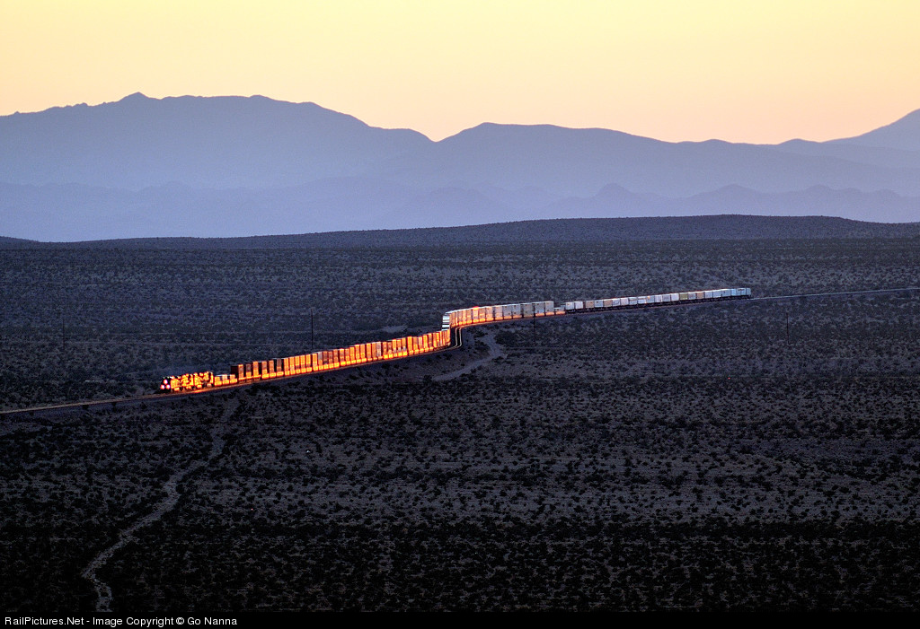I was satisfied with beautiful sunset trains west of Ludlow (refer my shot #385240). As I was about to leave the hilltop, I found another EB double stack approaching. At first, I estimated it was not fun to take pictures of this train because it became dark already. - NO, this idea was wrong. The sun still hit the corner of a distant S-curve to make an impressive scene as you see here.