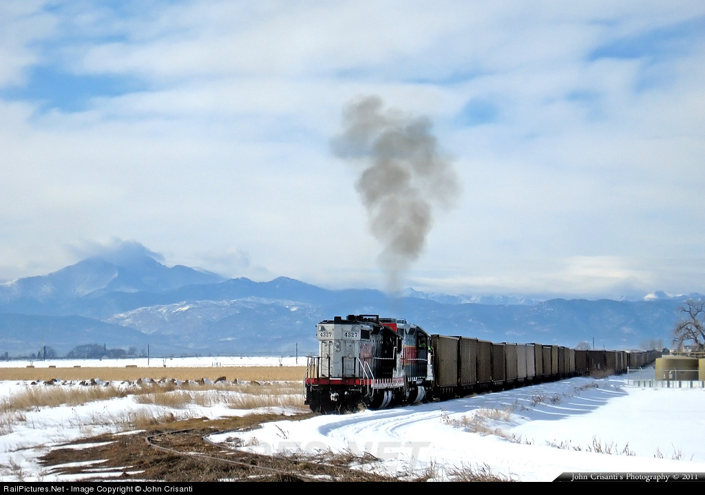 Lets Keep On Pushing! Working together, an SD9 and SD35 push 115 empty coal hoppers on the Welty Branch with the Rocky Mountains in the background and Longs Peak as well. What their intentions was that they needed to push these cars up the hill in the background to make room for more stored cars brought in by the UP. Experiencing air line issues on the cars made it extremely difficult to accomplish their task. After making trips back and forth a few times, the finally got half of their train across the hill. Another added issue to this task was that it created major wheel slip on the two locomotives. One could see these units do 10 - 15 MPH and in a matter of seconds slow down as they try to get the cut of cars. After their efforts have failed, they had to cut some country road crossings. Afterward, the 4327 uncoupled from the 2959 and they both followed each other on the same track right behind one another back into Johnstown, where they would go their separate ways for the rest of the day. A total of 4,250HP was used that day, but it just wasn't for enough for the train. Overhearing the engineer on OMLX 4327, she said if they had another unit, they would have made it. All in all, they tried their best and they can try again another day. Better luck next time fellas! For more information at what happened as well, Click here to view the video