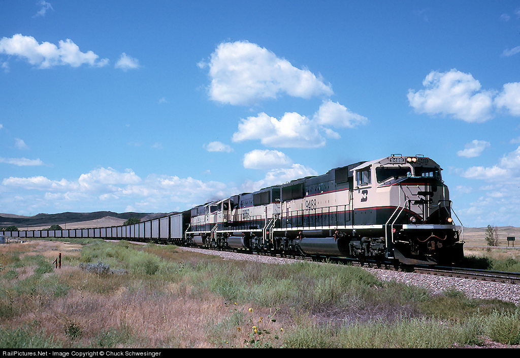 | BN 9488, BNSF 9821, BN 9524 move coal loads east under a beautiful sky west of Moorcroft. |
