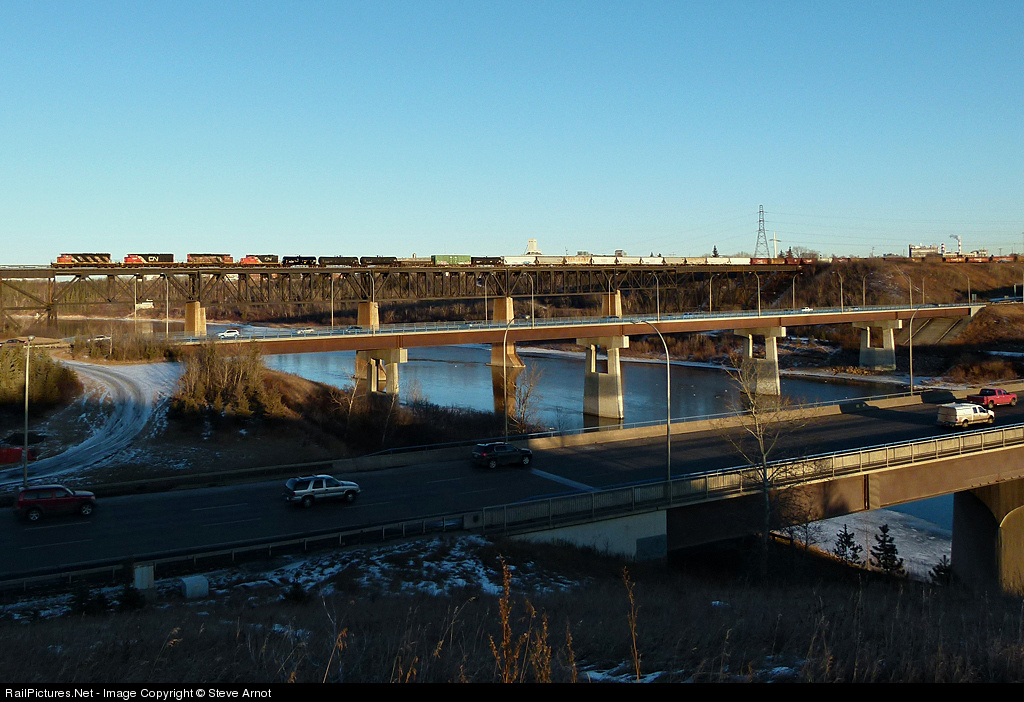 | SD40-2(W)s 5321, 5289, 5336 and GP9RM 7077 lead Calgary to Edmonton train 443 over the North Saskatchewan River on the 1,655 foot Clover Bar Bridge. |
