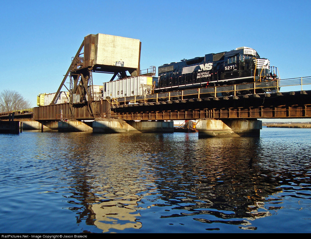 Sporting new paint, NS 5277 has finally lost its Conrail blue some 12 years after the breakup. The Conrail logo, however, still bares its mark on the Rahway River Drawbridge.