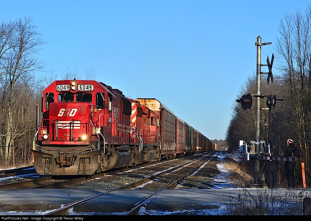 | On possibly one of the coldest days of the year, CP 147 heads westward screaming in notch 8 to defeat the Niagara escarpment with a Sooline SD60 and a CP sd40 hauling a solid string of autos westbound down the Galt sub |