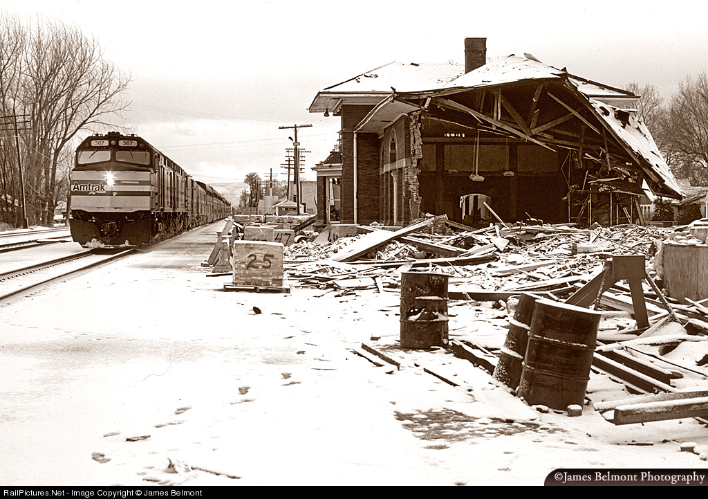 | A gloomy January morning in 1987 finds Amtrak's eastbound California Zephyr slowing to make its regular station stop at Provo while the D&RGW passenger station is being dismantled. The 75 year old structure was taken down over a three month period by a gentleman who purchased it outright and hoped to resell anything of value. Eventually the stacked and palletized brick and roof tile were moved off site so that a small, unheated glass transit shelter could be built in the Rio Grande depot's place. Progress? Hmmm. |