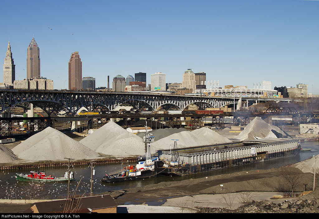 | The tug Wilf Seymour/barge Alouette Spirit with a load of steel slabs from ArcelorMittal Cleveland destined for ArcelorMittal Dofasco comes to a slow crawl with its two tugs waiting on drawbridge NS 2 which 309 is about to cross ahead. |