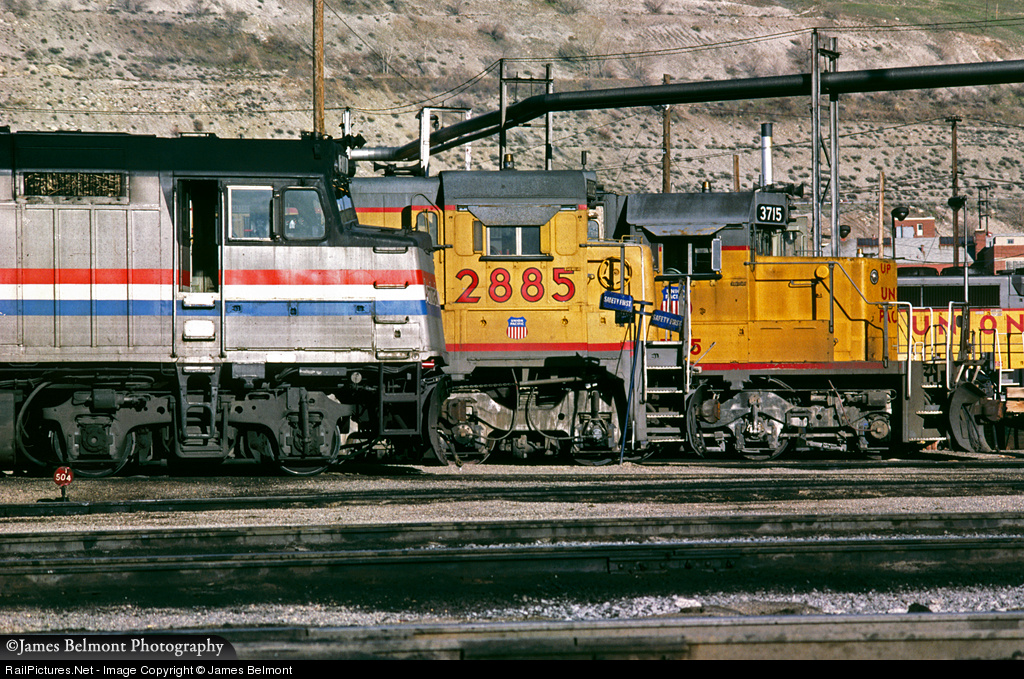 A profile of locomotives featuring 1970s technology line up at Union Pacific's North Yard shops: Amtrak F40PH #310, built by EMD in July 1979, is serving today as Metro-North Commuter Railroad #4194 (converted to an F40PH-2CAT), Union Pacific U30C 2885, built by GE in May 1974, was retired and traded to GE on a new C40-8 in June 1987, and UP 3715, built by EMD in January 1980, was retired by UP on November 29, 2000. As a side note, this property is now owned by the Utah Transit Authority called the Warm Springs Maintenance Facility and is off limits to trespassing. Not so in 1986 when visiting the North Yard shop area only required a hardhat and a responsible, safety conscious attitude.