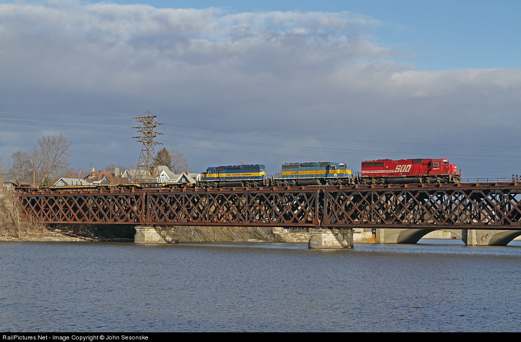 450 rolls SB over the Mohawk River. The 3 units have 67 cars for Kenwood Yard at the Port of Albany. 3 of the 4 roads CP owns in the US are represented in this consist, SOO-DME-ICE. The only road missing is the railroad the train is running on, the D&H. Trail units are DME 6364, City of Sleepy Eye and ICE 6215. The DME 6364 is the former MILW 203 and SOO 6364. The ICE 6215 is the former CP 5744.