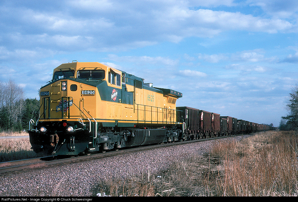 | Kind of a rare visitor to the CNW ore line was this job, both in power and car type. During the spring of 94 a couple train loads of ore were all-railed in these Ex PRR ore cars. Power ran through from Proviso so new big GE's were used. Here at Rock the 8625 leads a string of CR ore cars to the mine. |