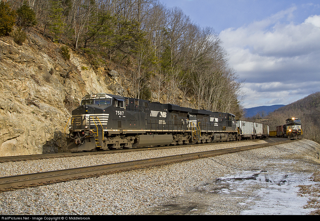 | Somewhat of a rare sighting with two westbound trains coming up the mountain on the main line - NS Train #825 on the left slowly climbs the mountain with NS Train #15T fast approaching on the right. January 2012. |