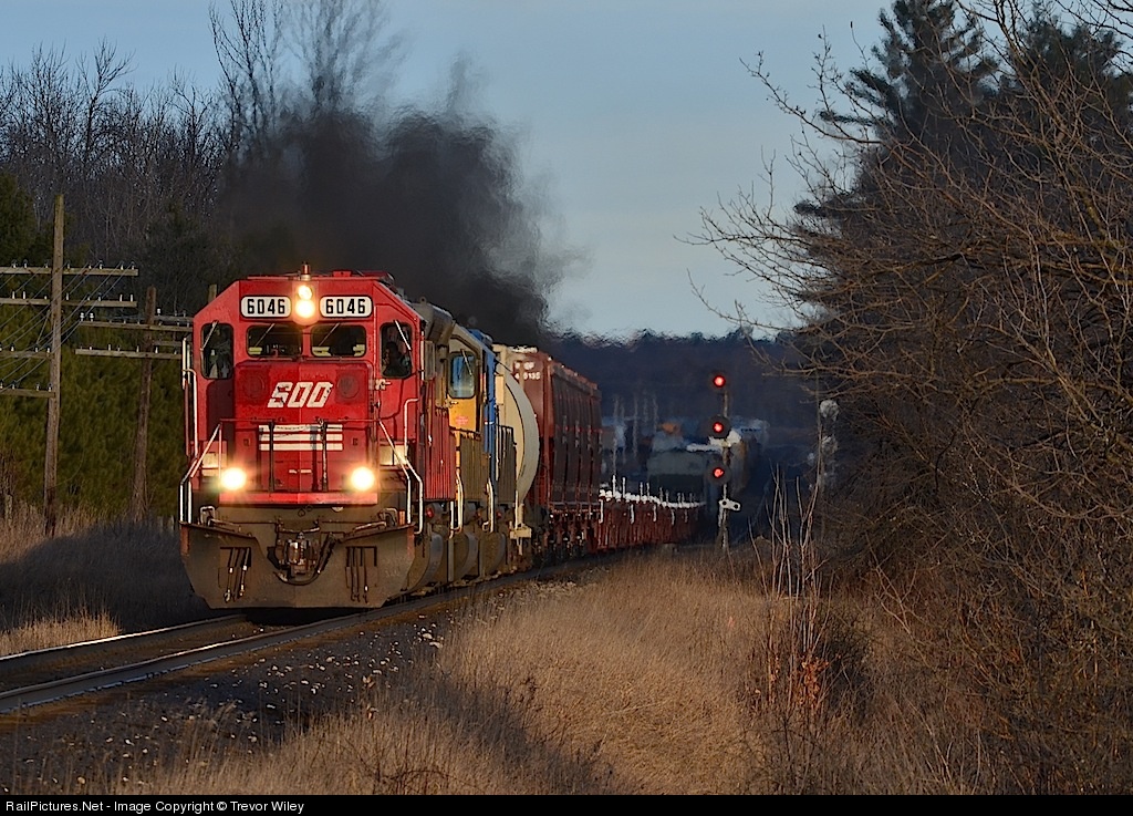 | Some Soo Line power leads a pair of rent-a-wreck units up and out of begin/end CTC sign Guelph junction with roughly 100 cars in tow and an OCS clearance right into Nissouri making this the last train on the Galt sub before sundown. |