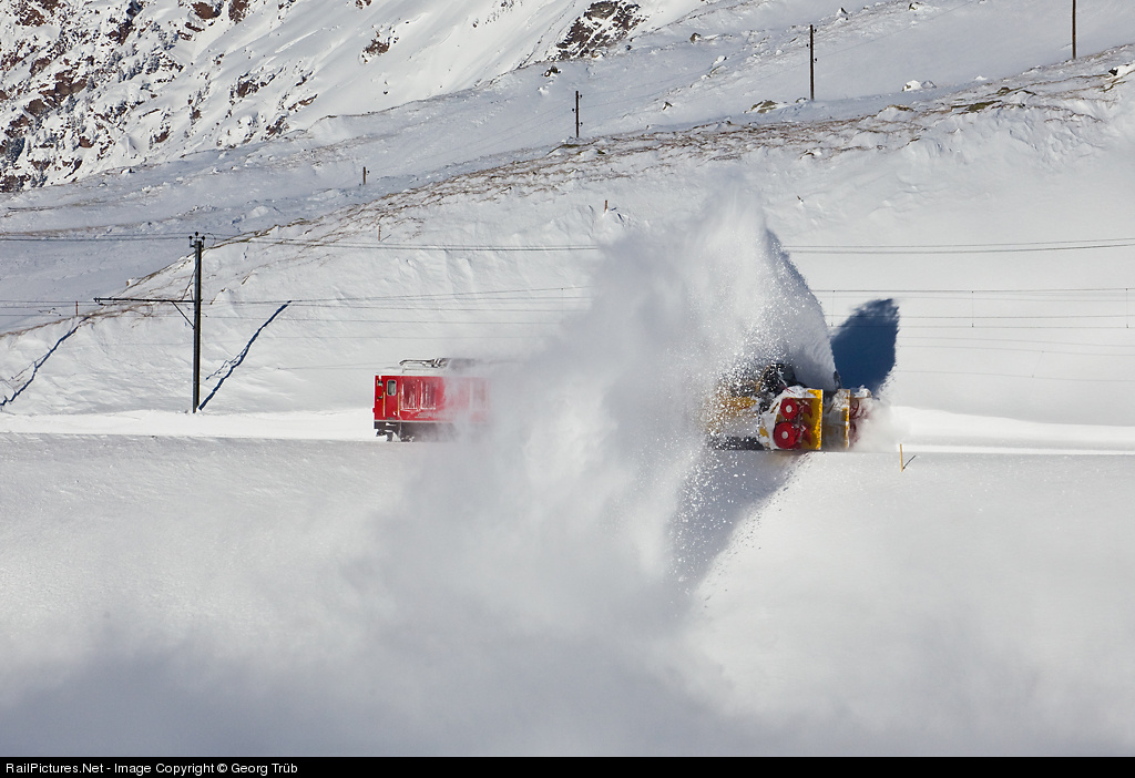 | The brand new snow blower X rot mt 95403 of the RhB in action near Ospizio Bernina. Shoving is dual system locomotive Gem 4/4 802 (electric/diesel). The new snow fighting system from Zaugg/Eggiwil is capable of clearing up to 8500 ton snow per hour and has a clearing width of 6 meter. |