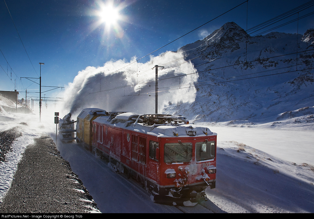 | The brand new snow blower X rot mt 95403 of the RhB in action in Ospizio Bernina. Shoving is dual system locomotive Gem 4/4 802 (electric/diesel). The new snow fighting system from Zaugg/Eggiwil is capable of clearing up to 8500 ton snow per hour and has a clearing width of 6 meter. |