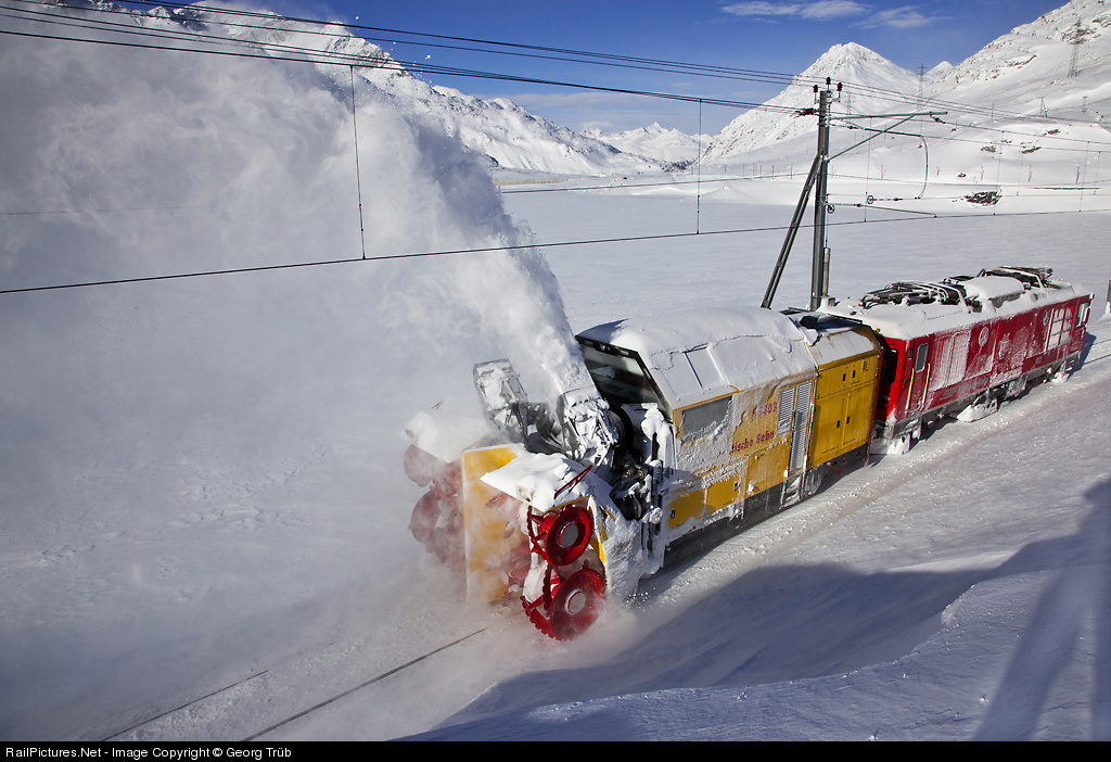 The new Bernina snow blower X rot mt 95403 from Zaugg company in Eggiwil/BE has a diesel power of 900 kW and is able to throw away up to 8500 tons of snow per hour. Here the two blower systems are in center position to clear the track 3 meter wide. Shoving is diesel/electric locomotive Gem 4/4 802.