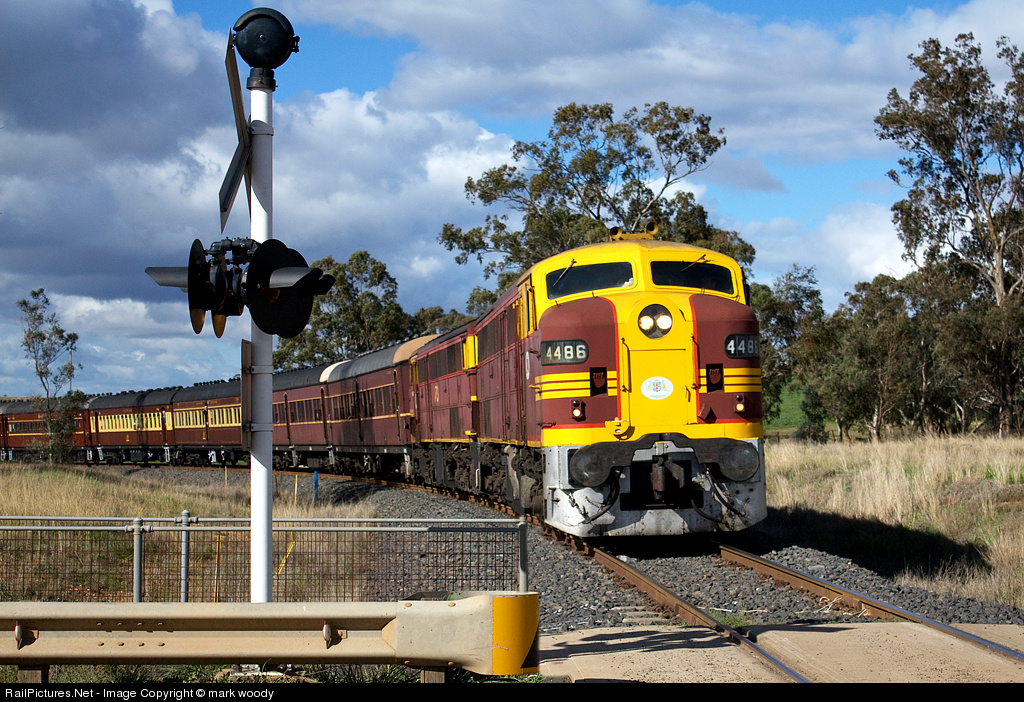 | Preserved Alco's 4486-4473 working a charter special from Merrygoen to Dunedoo and return with 12 passenger cars has backed the train out on the main and is about to pull forward into the loop to cross a loaded ore train it will return to Merrygoen, combine with the preserved steam section from Binnaway and travel to Dubbo as one train |