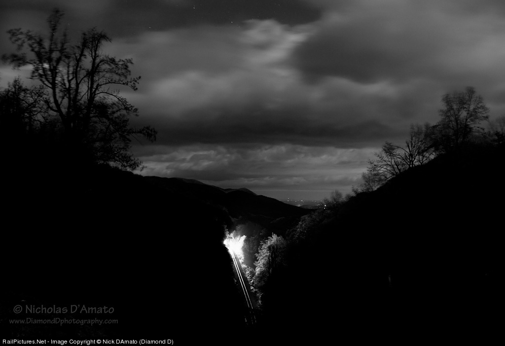 | As a stiff breeze from an approaching cold front blows the lingering clouds off the continental divide revealing the stars above, the trailing headlight of the helpers on a loaded eastbound coal train illuminate the tracks far below near the mouth of Swannanoa Tunnel. These manned helpers are necessary to help the 14,000 tons over the eastbound grades between Asheville and Ridgecrest, and now on their way down "the loops" they'll provide additional dynamic braking power. |