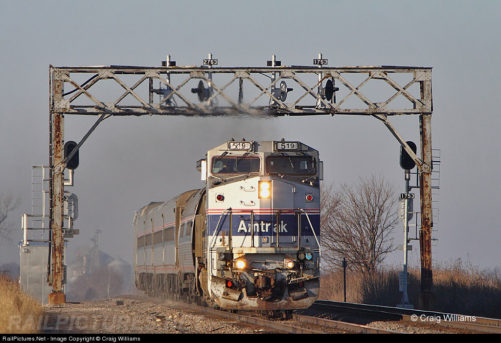 | The Carl Sandburg rolls east towards Chicago after a 08:56 station stop at Mendota a few minutes ago. BNSF have been replacing the old search light signals between Aurora and Galesburg to upgrade for PTC. Most of the new signals are in and working, leaving only thing left to do is tear down the old signals and bridges. |