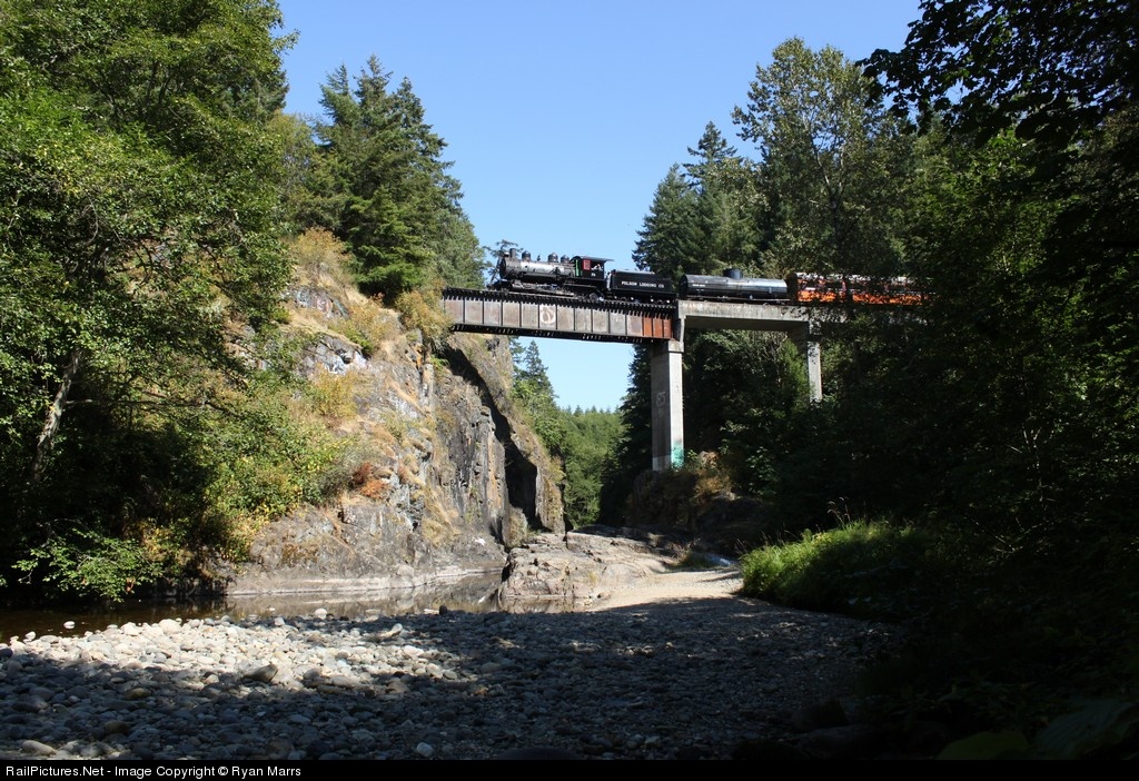 Polson #70 leads a special deadhead move over the Mashel River Bridge just south of Eatonville. The train is on its way to Tacoma where it will participate in Tacoma Rail's open house.