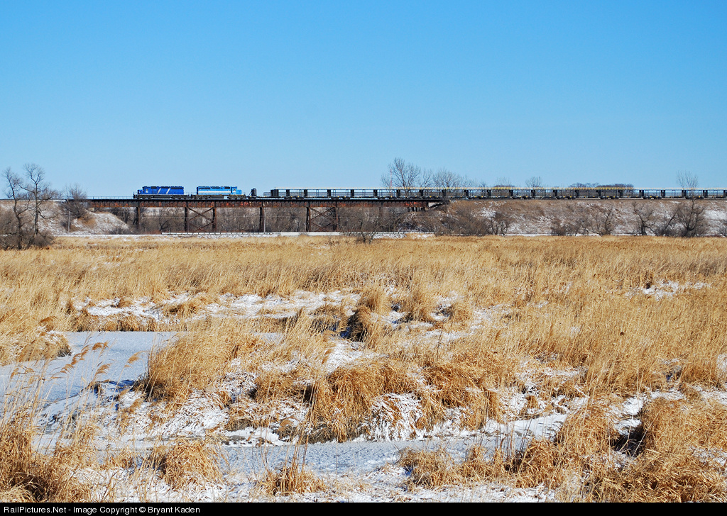 | Two leased SD40-2s, one CEFX and one NREX, lead a ribbon rail train across the steel trestle east of Hoffman, MN. |