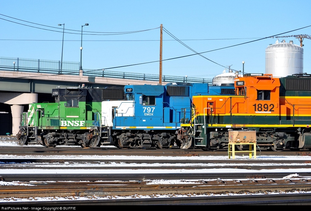 BNSF 2700 (GP39-2), EMDX 797 (GP38-2) and BNSF 1892 (SD40-2) are ready for servicing at the BNSF Engine Yard in Denver.