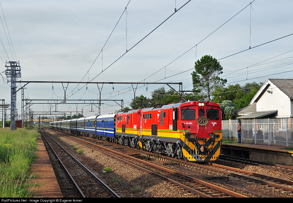 At least a dozen special trains operated from various parts of the country to the city of Bloemfontein for the ANC's 100th birthday celebrations on 8th January (ANC = African National Congress - South Africa's governing party). The various trains left Bloemfontein late on Sunday night and at 06:48 on Monday morning, the luxury Blue Train is seen running through Viljoensdrif station on the Free State main line, heading to Pretoria. The train is passing the signal cabin on the platform at this semaphore signalled station. The locomotives are brand new 18E's, rebuilt from ageing 6E1's and sporting the new Transnet Freight Rail livery. Note the video camera mounted on the front of the loco below the left cab window, transmitting pictures of the road ahead via cable to the on board closed circuit TV system.