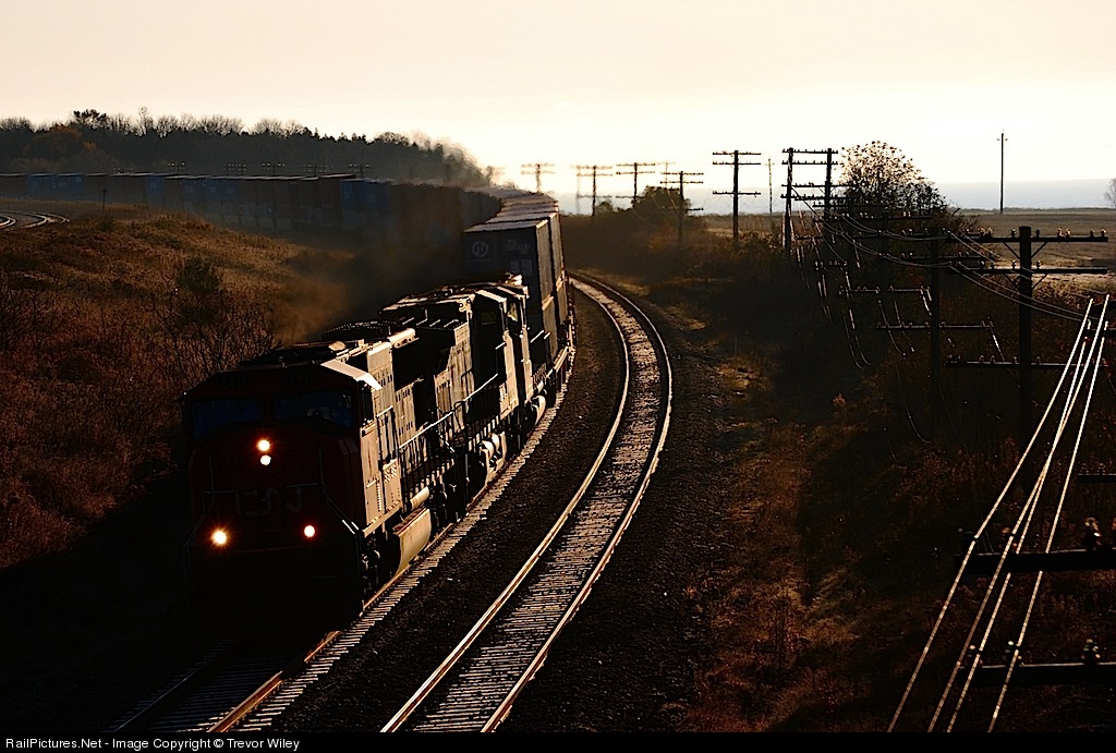 Just after another beautiful sunrise out in the country side, CN 121 with quite the lashup of a SD70i, BCOL dash9 and a CN SD40-2W wisp around the corner, rushing their hi-pri stacker while the sun shines strongly on the side creating some great "glint."