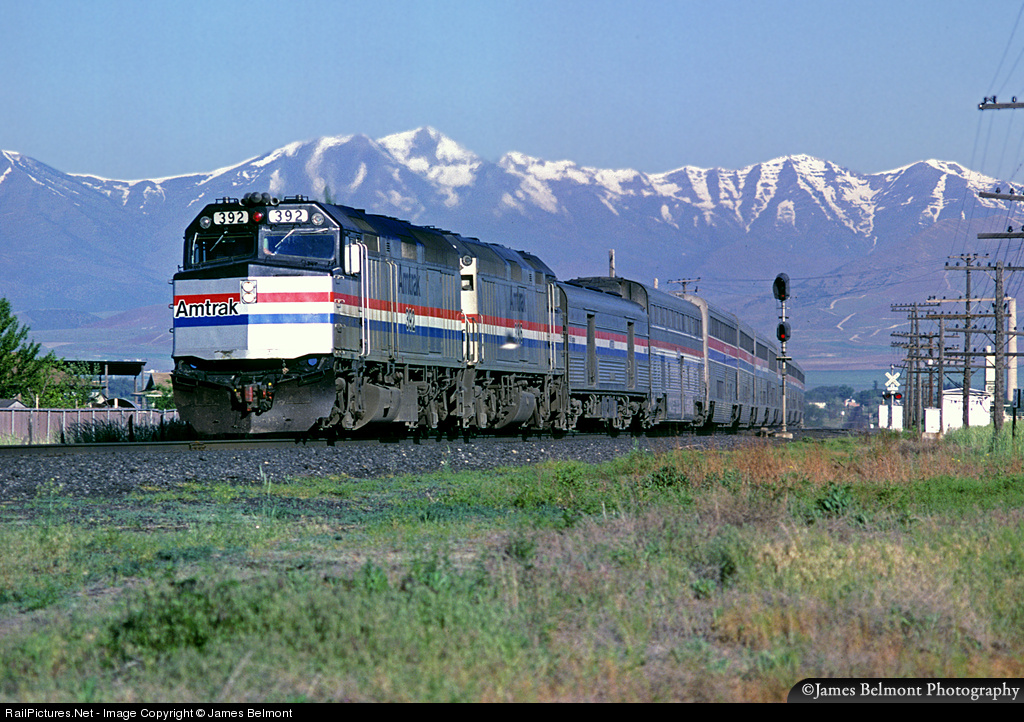 On a beautiful Spring morning in 1986, Amtrak's California Zephyr train #6 glides east on D&RGW rails at American Fork, Utah. Snowmelt on 10,620 ft. Flat Top Mountain of the Oquirrh Range is well underway by this date. See if you can spot a bird in flight in this Kodachrome photograph.