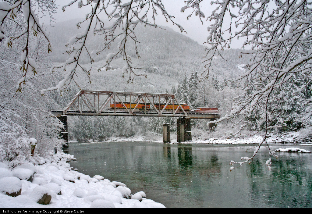 Ross, Joel and I have spent the last 45 minutes staked out at our chosen spots along the Skykomish River waiting for the dirt train to free itself from the embrace of winter. After what seemed like an eternity (frigid one at that), they finally determined it wasn't winter and ice that was holding them back, but a few extra brakes. Free at last, the crew is charging up the hill to Scenic where they will wait their turn for passage through the Cascade tunnel and points east. Along the way they'll cross several bridges. Here they are at the Foss River bridge. -- Here's Joel's take at Big Eddy