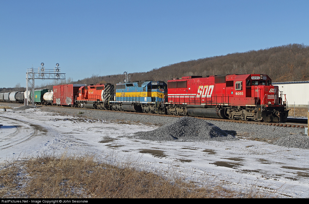 | 450 rolls thru CPF-468 at normal speeds now that all tracks are in service. The 3 units have 46 cars for Kenwood Yard at the Port of Albany. Trail units are DME 6364, City of Sleepy Eye and CP 6069. The DME 6364 is the former MILW 203 and SOO 6364. |