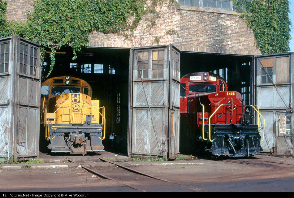 | A pair of ex-AT&SF Alco RSD-15s poke their alligator snouts out of the ivy-covered LS&I enginehouse at Marquette, MI. K64, Yashica TL Electro-X. |