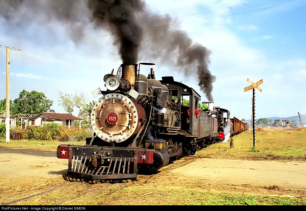| Minaz #1321 (a Baldwin locomotive from 1913) is leaving the Potrerillo loading point with a loaded sugar train. Sister engine #1355 (a Baldwin locomotive from 1920) is helping to pull the heavy and long train. |