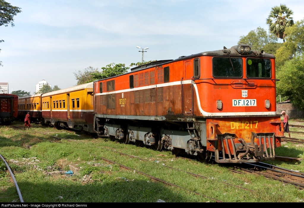 | DF1217 is seen departing Yangon central station with a local train to Ywa-Thargyi, one of 27 locomotives delivered to Burma back in 1964