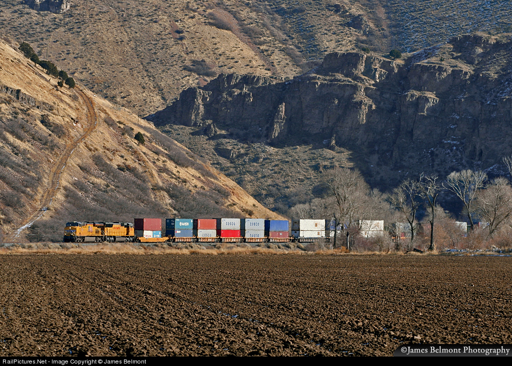 | A colorful UP Global 3, IL to Long Beach, CA stacker emerges from the Weber River Narrows east of Morgan. |