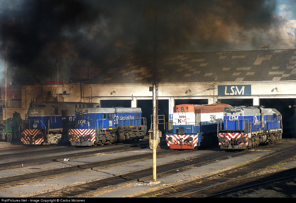 From left side to right, ALCo RSD 16 #B819; GM GR 12W #A625, GAIA (powered by ALCo) #5284 and GM GT 22CW #A914 at Retiro Workshops. The smoke in the top part of the image, comes from another ALCo RSD 16, with a commuter train.