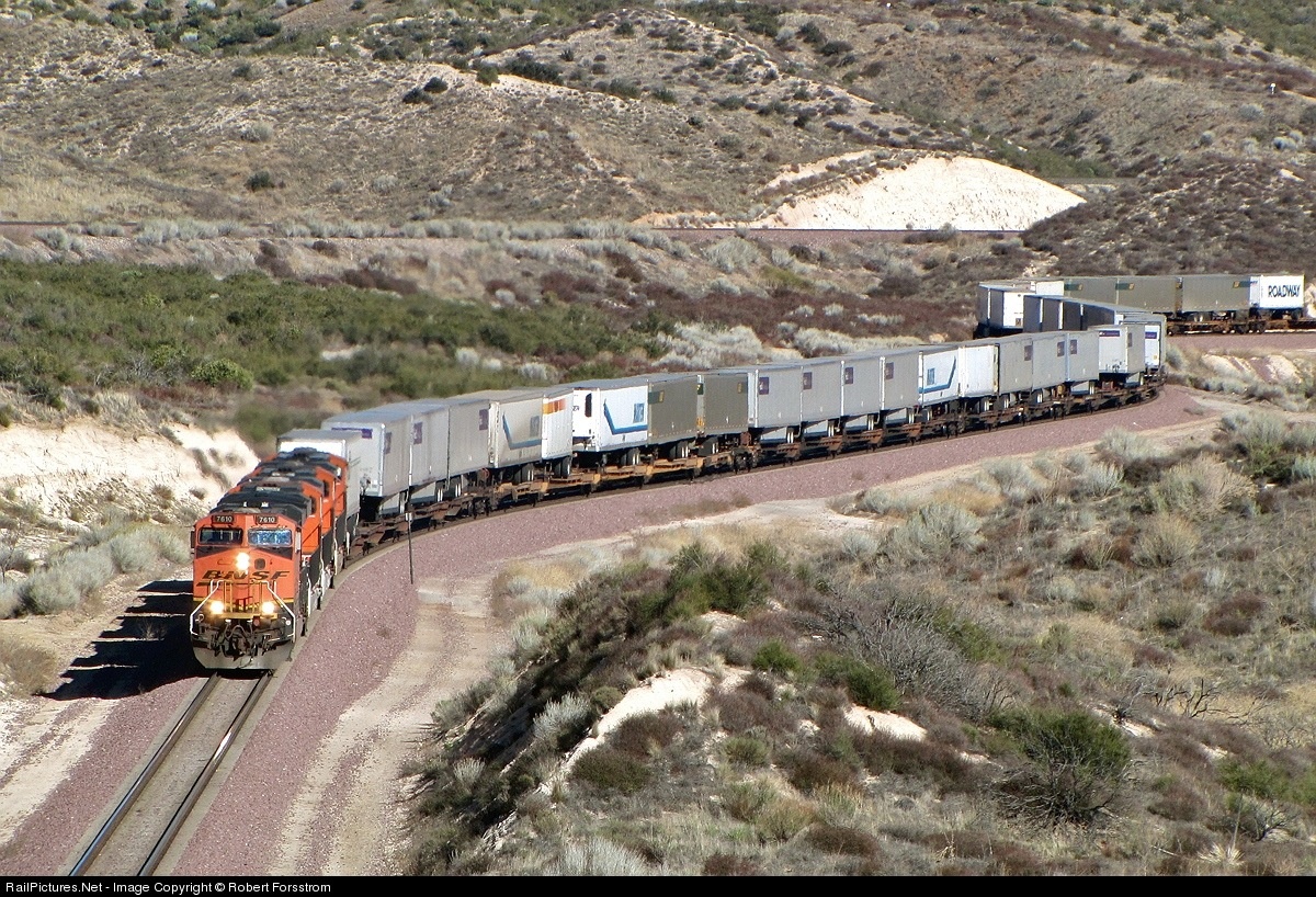| Things aren't all as they seem in this photo. A "repo-train" full of empty trailers being transferred from Phoenix, AZ to San Bernardino, CA is easing down the steep 3.0% grade of Main 3 (the old route) on BNSF's Cajon Sub in Southern California. |