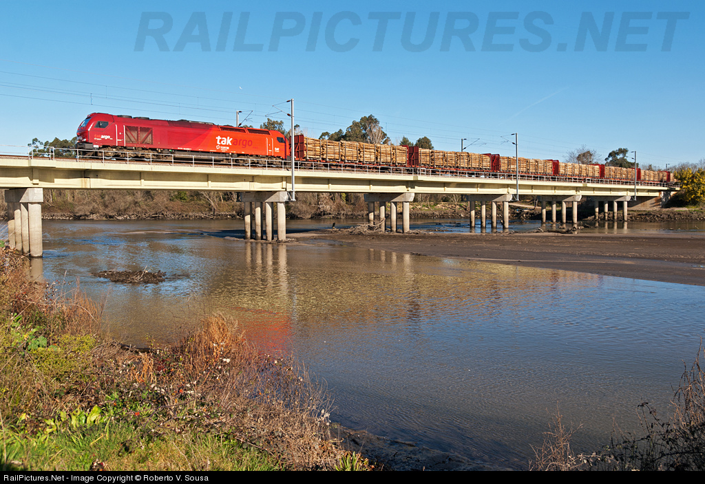 Takargo rail taking an internacional wood train from Lugo (Spain) to Celbi factory (Portugal), here already in the Portuguese route (Tuy-Celbi). The place of the photo is in Cacia, more precisely in the bridge over the Vouga river, near Aveiro. In the winter, is very unusual the low level of the river, as you can see.