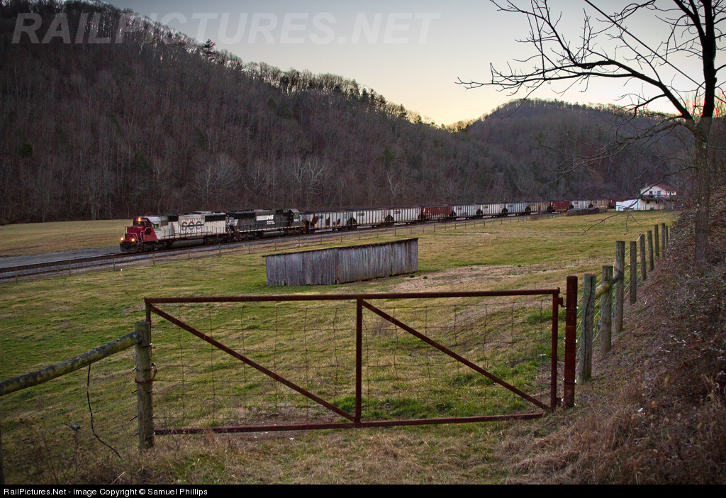 NS 758 rolls through Northfork, VA in the last light of the day with a interesting lashup of power featuring two SD60s.