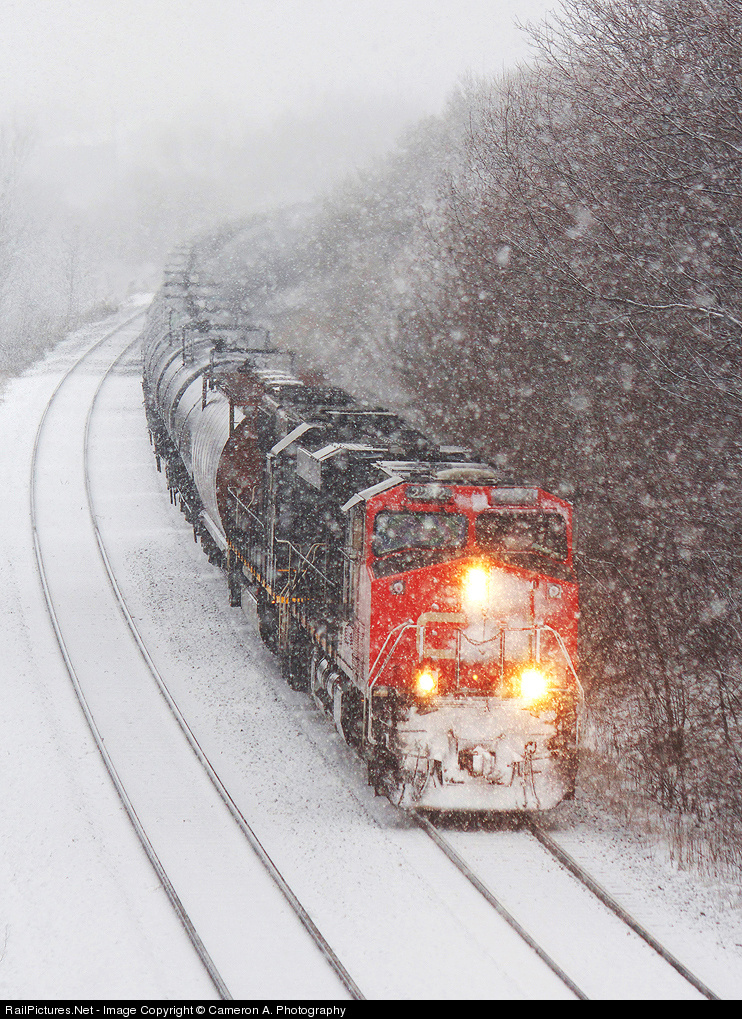 After a successful chase of CP's Havelock Job, me and a colleague headed for the Kingston Sub. In this photo, CN 305 takes the curve at Wesleyville Rd in some awesome snow.