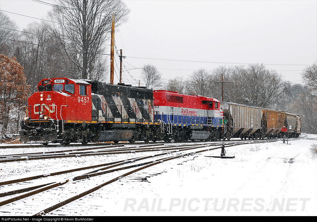 New England Central Railroad White River Jct., VT local train 600 hardly looks like the NECR! A recent addition to the NECR roster, yet still carrying the RMPX marks, GP40-2W 9457 is joined by sister GP40-2W TP&W 4053 in RailAmerica colors while working the train past the Vermont Rail System yard with salt hoppers. COMING SOON: Eastern Railroad News Online Magazine RETURNS July 1, 2012! http://easternrailroadnews.com