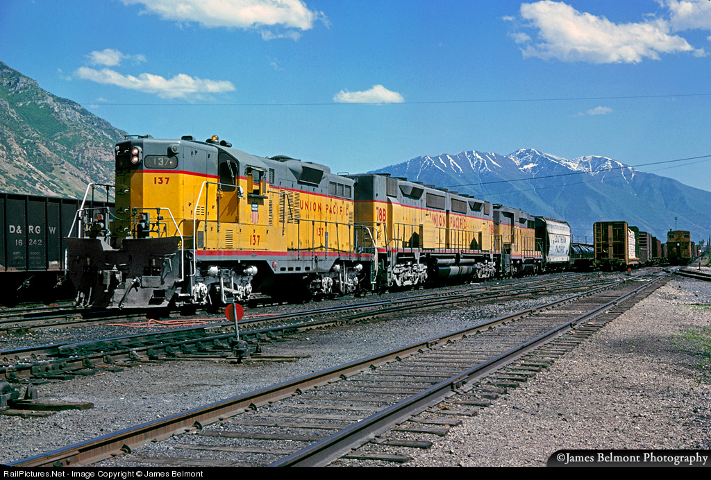 | Here's an example of a power lash up that made the Union Pacific a 'Diesel Spotters Guide' dream come true in the 1960s and 70s. An EMD GP9, a DD35B and a GP30B prepare to depart Provo Yard for North Yard in Salt Lake City. Check out the oversize snow plow on the UP 137, not likely to be of much use on this warm June afternoon! |