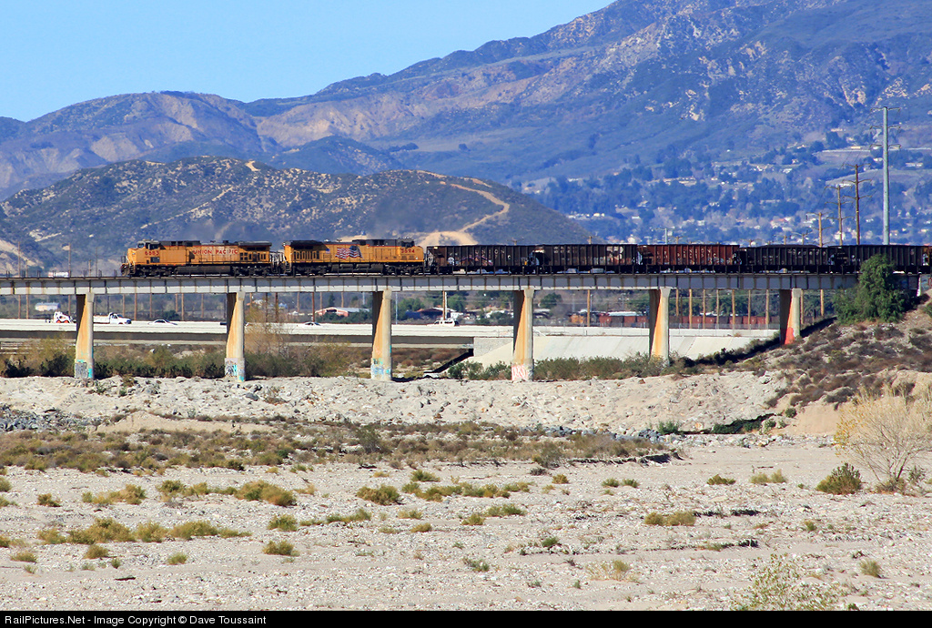 A southbound UP coal train crosses over Lytle Creek in San Bernardino enroute to West Colton. In the background you can see the DPU's under the bridge.