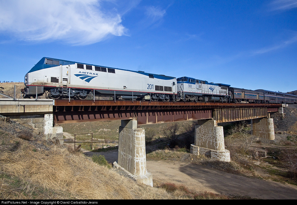 | Due to track work on the Coast Subdivision, Amtrak rerouted their northbound Coast Starlight through the Tehachapi Mountains. AMTK 201 and a Dash 8 numbered 503 leads today's Starlight over the bridge at Rowen as it was the first train to go through the pass since track work has been in progress all day. |