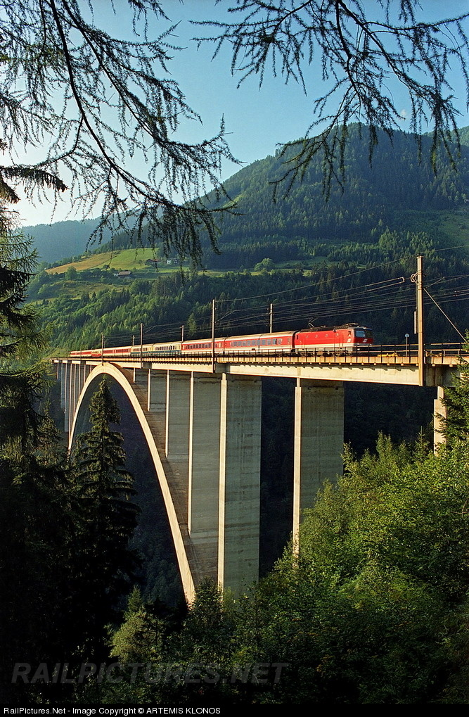The EC train from Germany which is hauled from one 1044 class locomotive passing the “Pfaffenberg Zwenbergbrücke”, in direction to Villach. This double line concrete bridge was build between 1969 - 1971 and is the highest in Austria with 117 m. height and length 377 m. (central span 200 m.). Is located in km 57,494 between Schwarzach St. Veit - Spittal – Villach line.