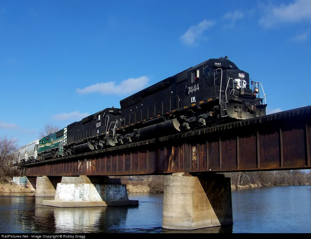 IR SD45R 7444, a tunnel motor and one of the HBR SD50s lead the 107 job over the Fox River.