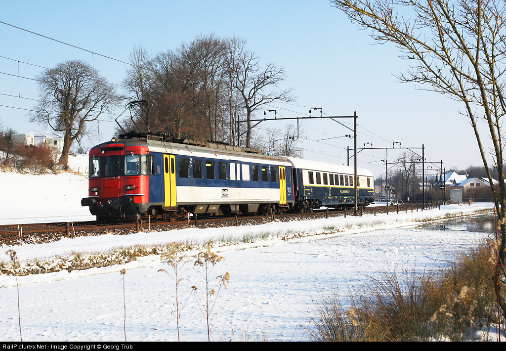 Former SBB railcar RBe 205 of the Oensingen-Balsthal-Bahn is pulling luxury dining car "Le Salon Bleu" 1071 of the Prestige Continental Express (PCE) along the partly frozen fabric canal in Bürglen. This was a charter train for a "Golden Wedding" celebration.