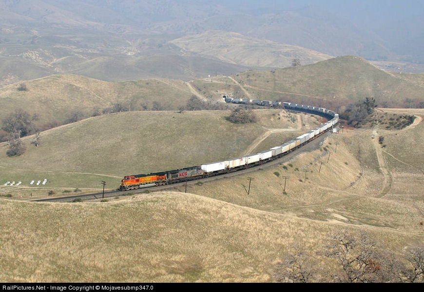 BNSF and KCS power lead this Southbound intermodal up the Tehachapi grade between tunnels 1 and 2 in March of 2005.
