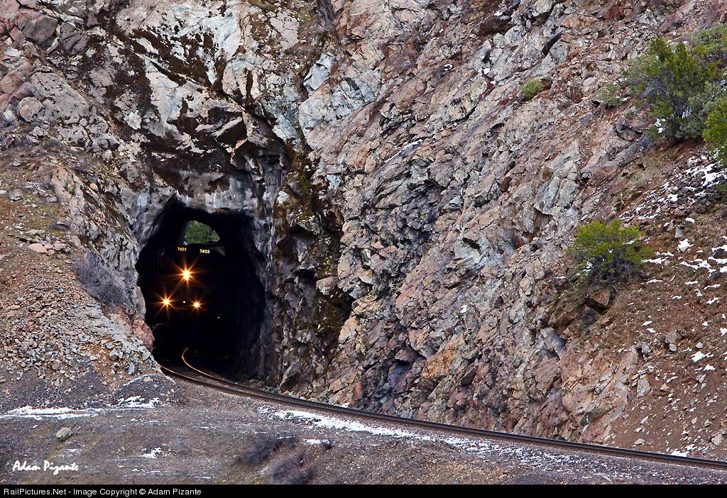 A rerouted stack train's lead unit lights up one of the many tunnels in the Feather River Canyon, as it inters it on its way to bay area.