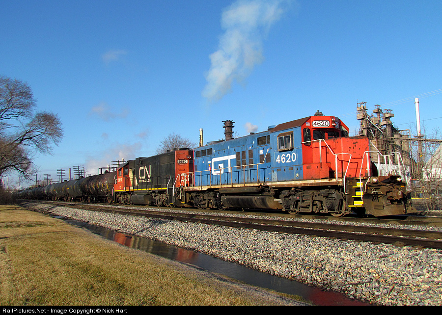 GTW 4620, a GP9R that's still kicking in its classic paint scheme, has finished up with its work at the Seneca plant in Lemont. Built as the Central Vermont Railway (CV) GP9 4928, in December of 1957, this unit has definitely seen a lot of action and it's still working on a Class 1 mainline in 2012. That's quite impressive.