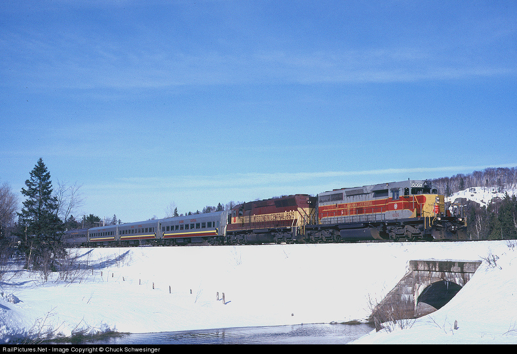 | WC 6005,6575 roll south with train 4 near Odena. The WC often used freight units on the Snow Train as the F's were normally used on trains 1&2 to/from Hearst and also often became tied up in freight service between Sault Ste. Marie, Ont. and Gladstone during the winter months. |