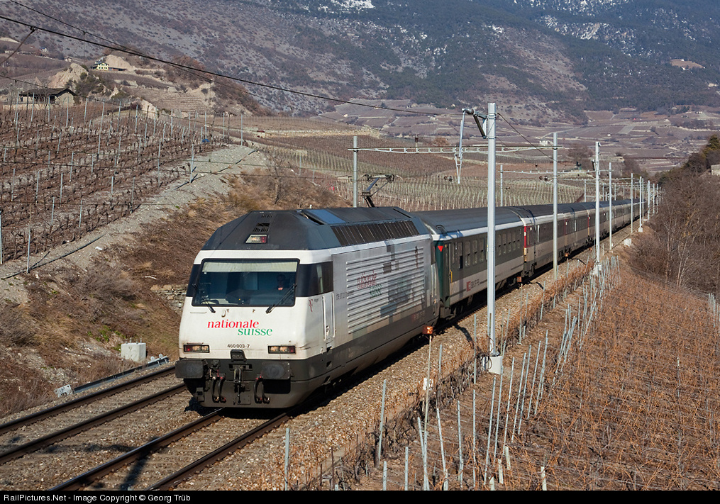| The Swiss insurance company "national suisse" makes publicity on the Re 460 003 with tennis star Roger Federer. The locomotive is pulling InterRegio 1426 from Brig to Geneva Airport through the vineyards between Salgesch and Sierre. |