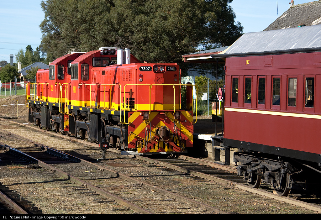 Now proudly owned by OTHR ex NSWGR, ex Patrick Portlink 73 class 7307-7321 diesel hydraulic locos built in 1971 sit at Oberon platform with preserved passenger cars.